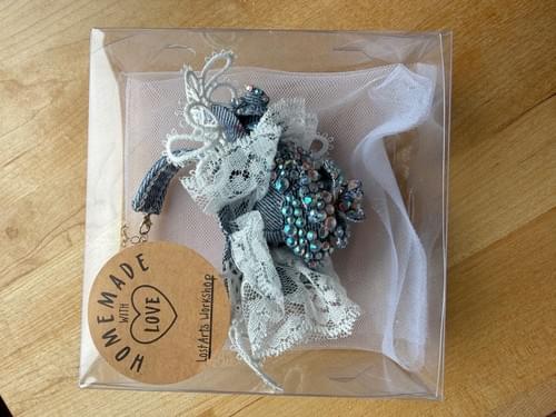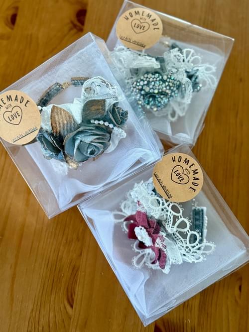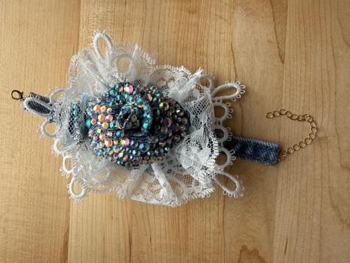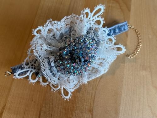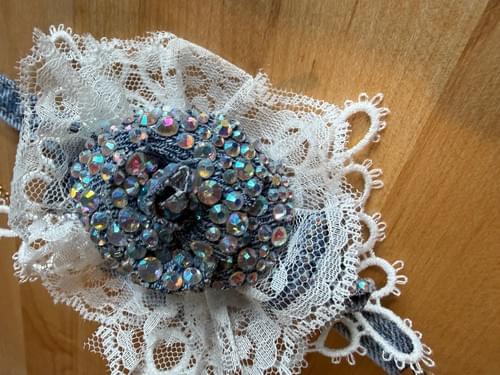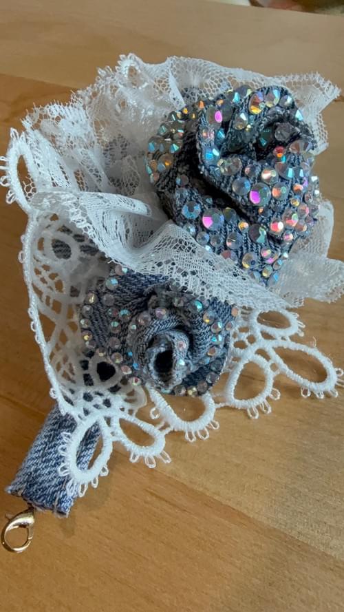 This stunning corsage is made with reused denim, lace, paint, pearls and more. it is a keep-sake that will never die and could be a show stopper at your next special occasion.